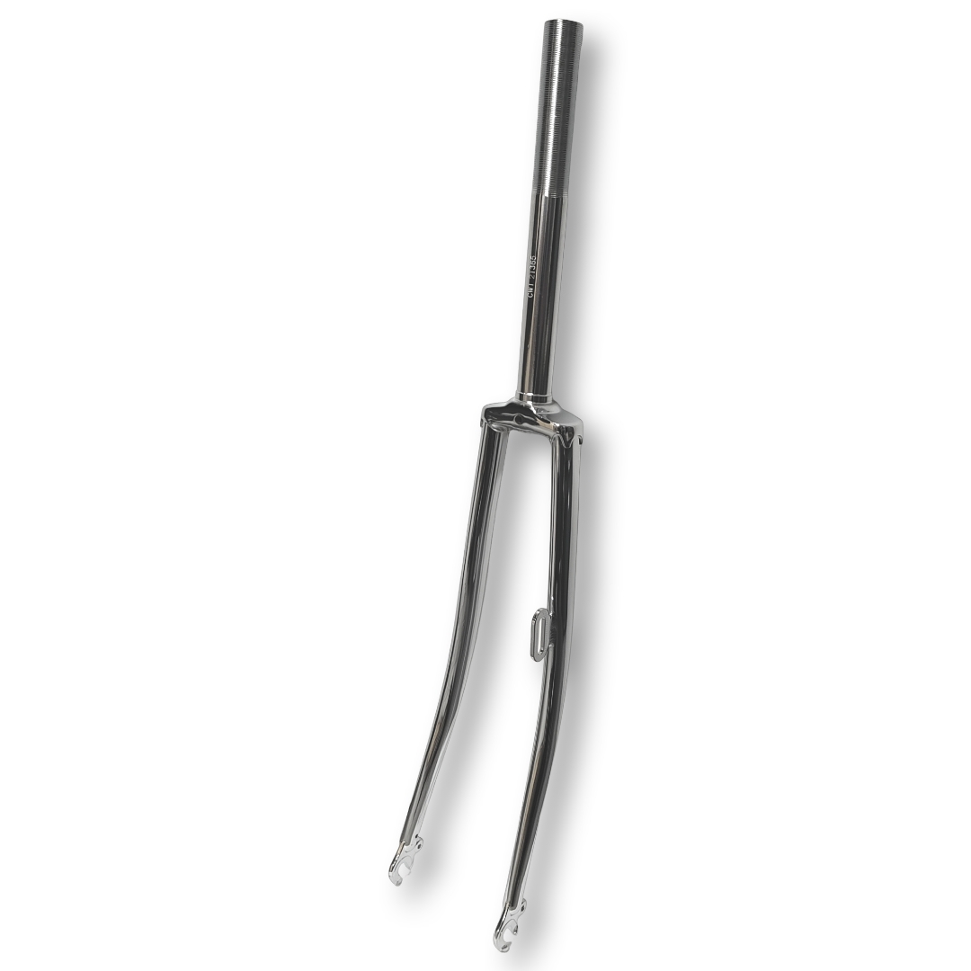 Hochwertige und schön verarbeitete Fahrradgabel des namhaften japanischen Herstellers Tange. Ein guter Ersatz bei alten Velos mit 28″-Rädern. Dank der verchromten Oberfläche passt die Gabel zu allen Rahmenfarben. Mit geschiedeten Ausfallenden. Mit Dynamohalter für linkslaufende Dynamos.